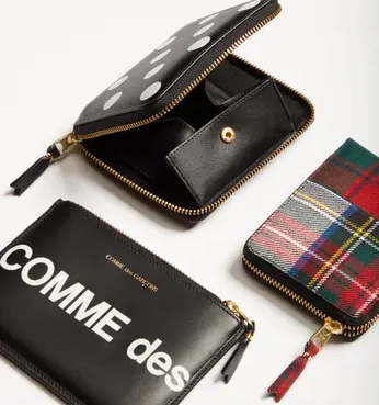 SSENSE 现有 COMME des GARÇONS 钱包新加入 灰白色 Classic 钱包$80 黑色压花手拿包$90。