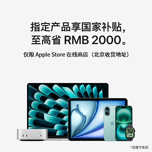 2、指定产品享国家补贴,至高省2000元,仅限 Apple Store 在线商店(北京收货地址)参加,操作步骤如下或点击此处了解详细信息: