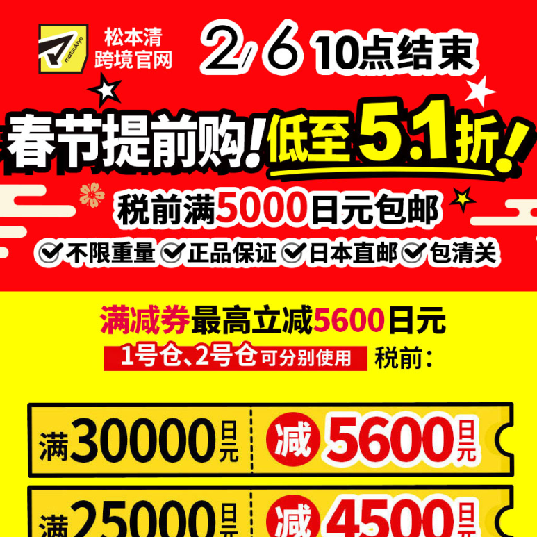 松本清(Matsukiyo CN) 现有 春节提前购 低至5.1折 税前满5000日元包邮 叠最高再减5600日元券。