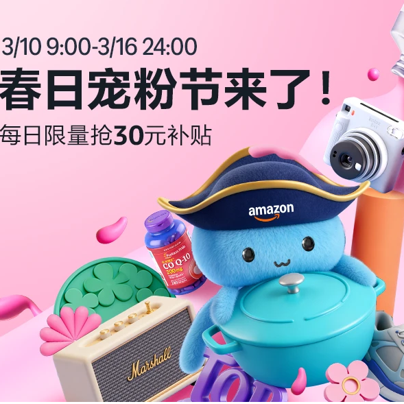 亚马逊海外购 现有 春日宠粉节 关注马歇尔、欧莱雅、富士、爱步、飞利浦等 每日限量抢30元补贴。