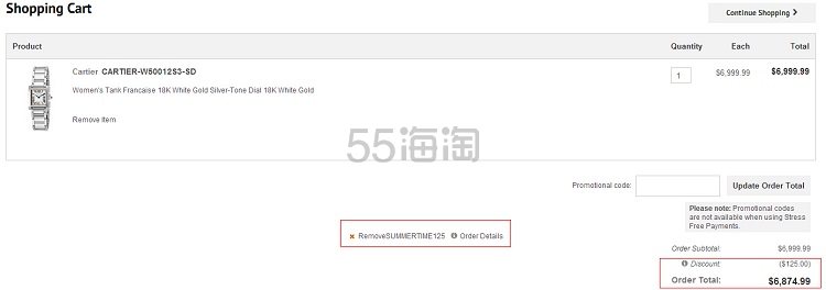 World of Watches 现有Cartier卡地亚Tank坦克系列18K白金奢华女表,型号W50012S3,原价$16100,现价$6999.99,使用优惠码:SUMMERTIME125 后,入手只要$6874.99,约46900元,免美国境内运费,支持转运回国。立即购买>>