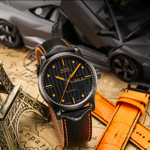 MIDO美度的舵手系列以高颜值、高性能而出名,外貌年轻鲜活,具有完美的防水、防磁和防震能力。这款型号M005.430.36.051.80的Mido美度男表,内置一枚美度自制的C07.621机械机芯,42mm表径的黑色大表盘,搭配橙色走线的黑色牛皮表带,配上舵手系列特有的纵向日内瓦波纹,颜值不许多说。