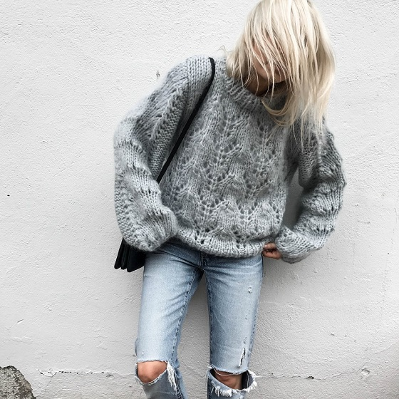 Ganni 是欧美圈时尚博主很喜欢的一个品牌。5姐经常能在Instagram上刷到这个丹麦品牌的街拍图哦。夏天穿 Ganni 的 Slogan T,秋冬就要穿它家的海马毛毛衣。这款圆领套头毛衣除了冰淇淋蓝色、还有亮丽的橘黄色和甜美的粉色哦~