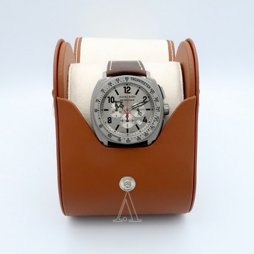 JeanRichard 尚维沙 Aeroscope 系列主打飞行腕表,设计充满航空飞行元素。60650-21G211-HDEA 采用JR66自动机械机芯,43石,振频28800v/ph,动力储备42小时,钛钢表圈上黑色大阿拉伯数字时刻,配合银*表盘上的黑色夜光阿拉伯数字时刻和指针,易读性很强;设计独特的镂空箭头指针外加醒目的红色秒针十分亮眼,经典三眼计时,灵感来自于飞机控制板仪表盘,超长计时按钮,4-5点间设日历窗,操作读数也非常方便;同材质钛钢表盘方中带圆,质朴大方,硬朗不失圆润,轻质坚固,呼应小牛皮表带,色调简洁,对比鲜明。表径44mm,厚13mm,100m防水,非常适合休闲佩戴。