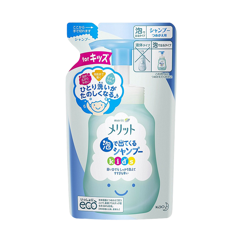 花王 Merit 儿童宝宝弱酸性泡沫洗发水,可以使小宝宝对自己洗头产生兴趣,按几下泵,丰富泡沫立马出来,洗尽头发各个角落,汗和污垢也能轻松去除。弱酸性,*配方,给宝宝*的呵护;丰富泡泡,非常容易冲洗,不残留;即使冬天头皮干燥也能轻松解决。已经有起泡瓶的可以买这组补充装倒进去用哦!